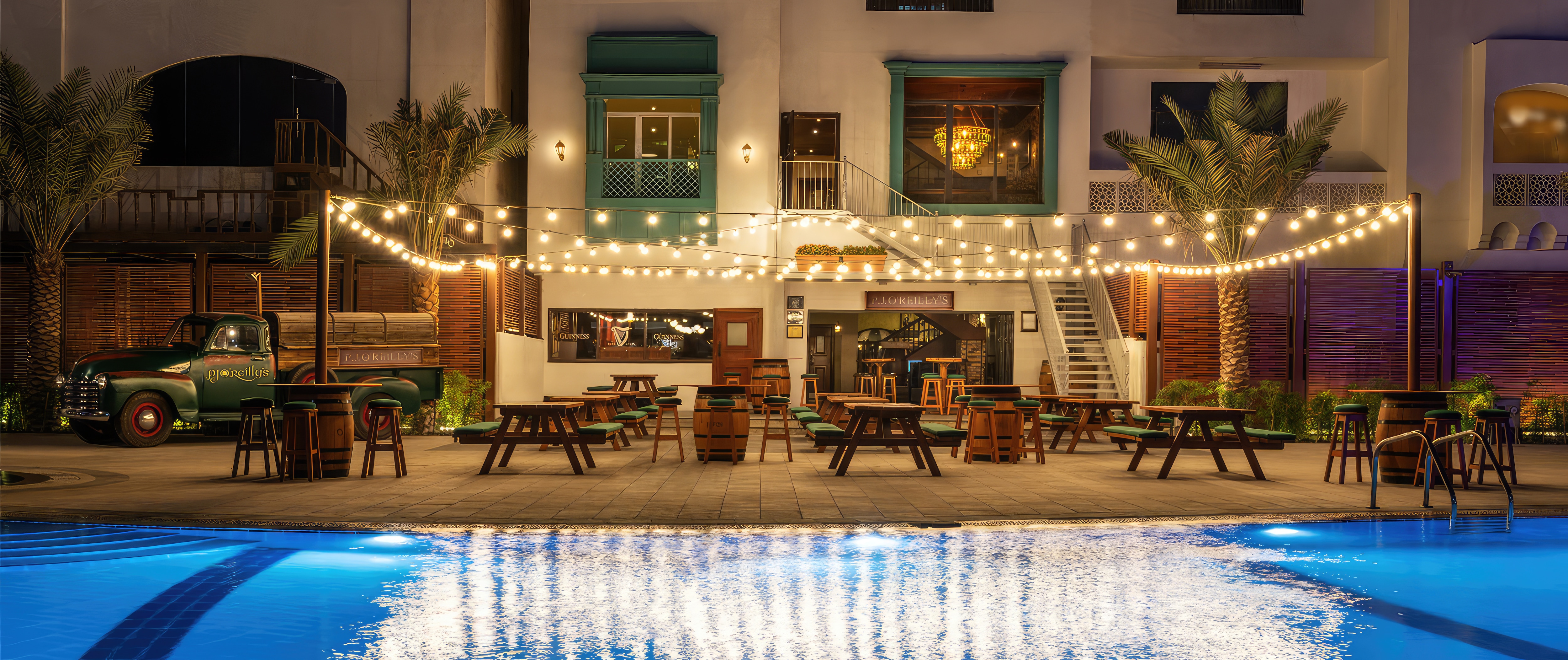 Discover Abu Dhabi's culinary treasures, each offering a unique experience. Admire the panoramic views at Stratos Revolving Lounge, the city's only revolving lounge, savour Nonna's time-honored Amalfi Coast recipes at Amalfi Ristorante, delight in inventive farm-to-table dishes at Market Kitchen, explore the legendary PJ O'Reilly's Irish Pub, enjoy coffee moments at Latitude 24, and indulge in a chic Signature Breakfast and themed nights by the poolside at Café Palmier.