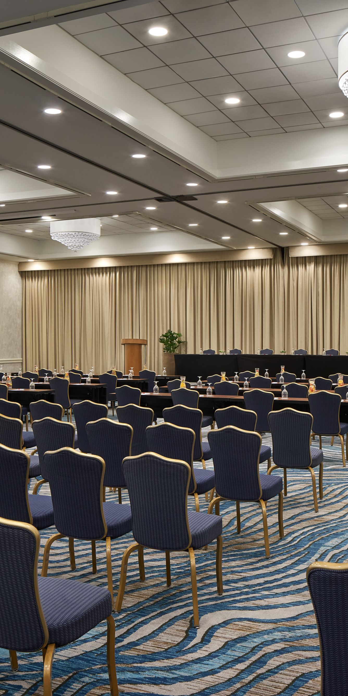 This 5,053 sq ft ballroom is ideally suited for theater-style or schoolroom-style seating arrangements, perfect for holding conferences or training sessions.