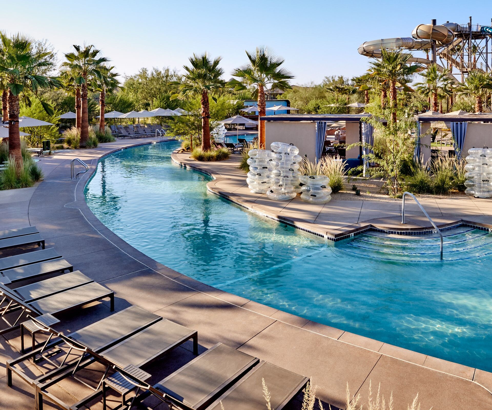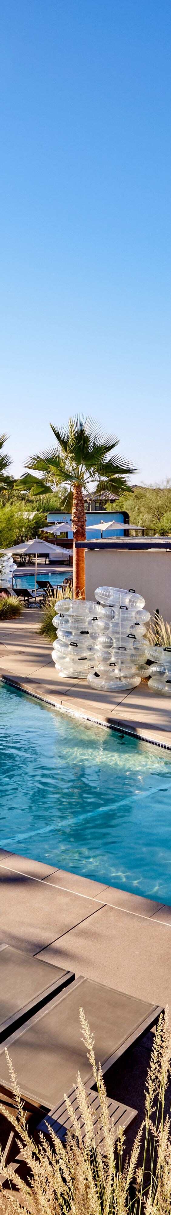 At AquaRidge, within JW Marriott Desert Ridge, a premier waterslide hotel in Phoenix, AZ, there's something for everyone to bask in the sun and revel in the pools. The vast complex features the winding Canyon Creek Lazy River, two lively splash pads, inviting fire pits, and the centerpiece, Wildfire Grove. Wildfire Grove includes our main pool with a captivating waterfall tower and an activity pool. For exclusivity, Sedona Cove offers a gracefully curved pool with VIP cabanas and lounge chairs. Enjoy the Sedona Springs whirlpool’s soothing warmth amid stunning mountain views. For an adults-only retreat, Sky Island awaits those 21 and over.