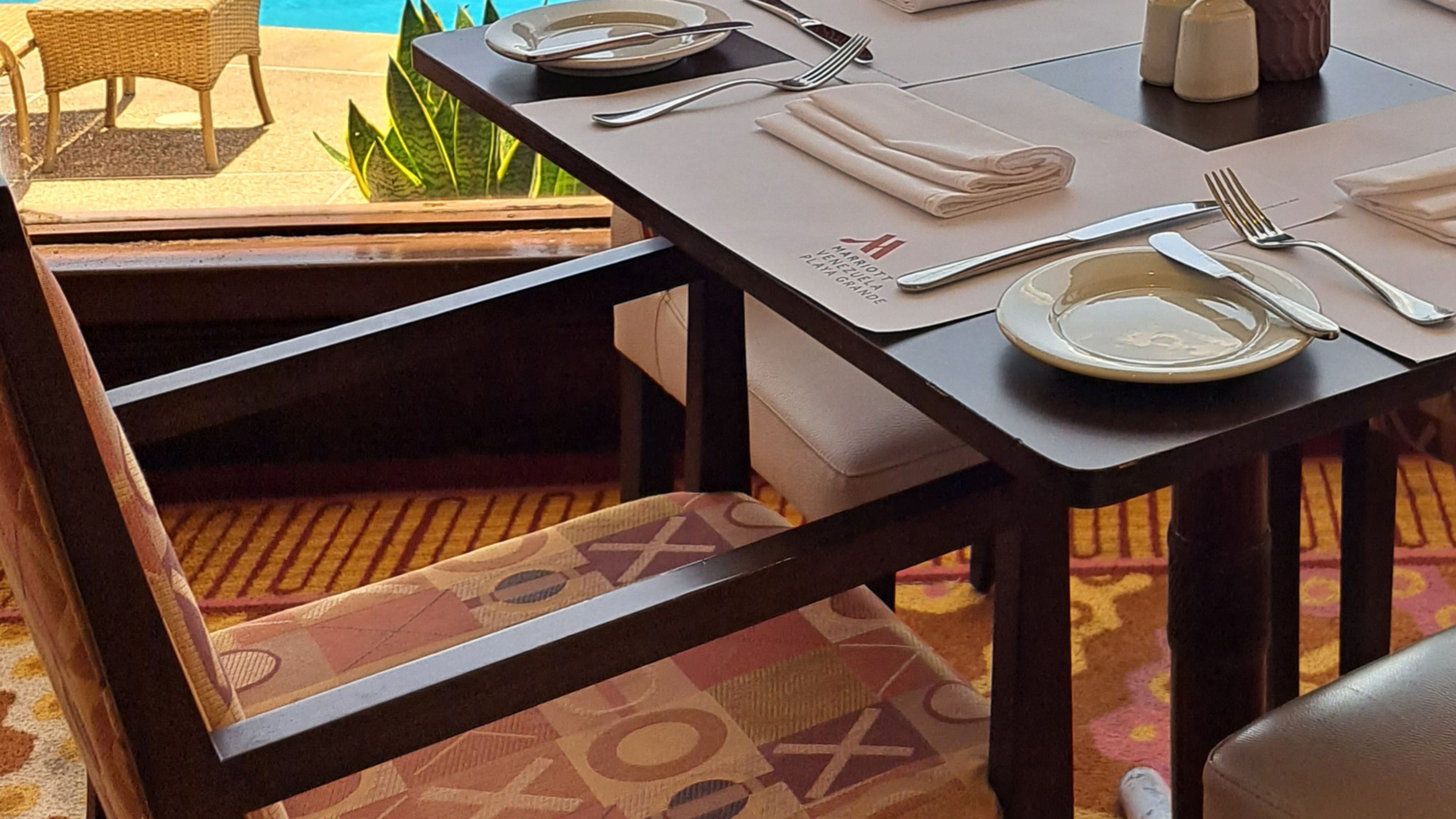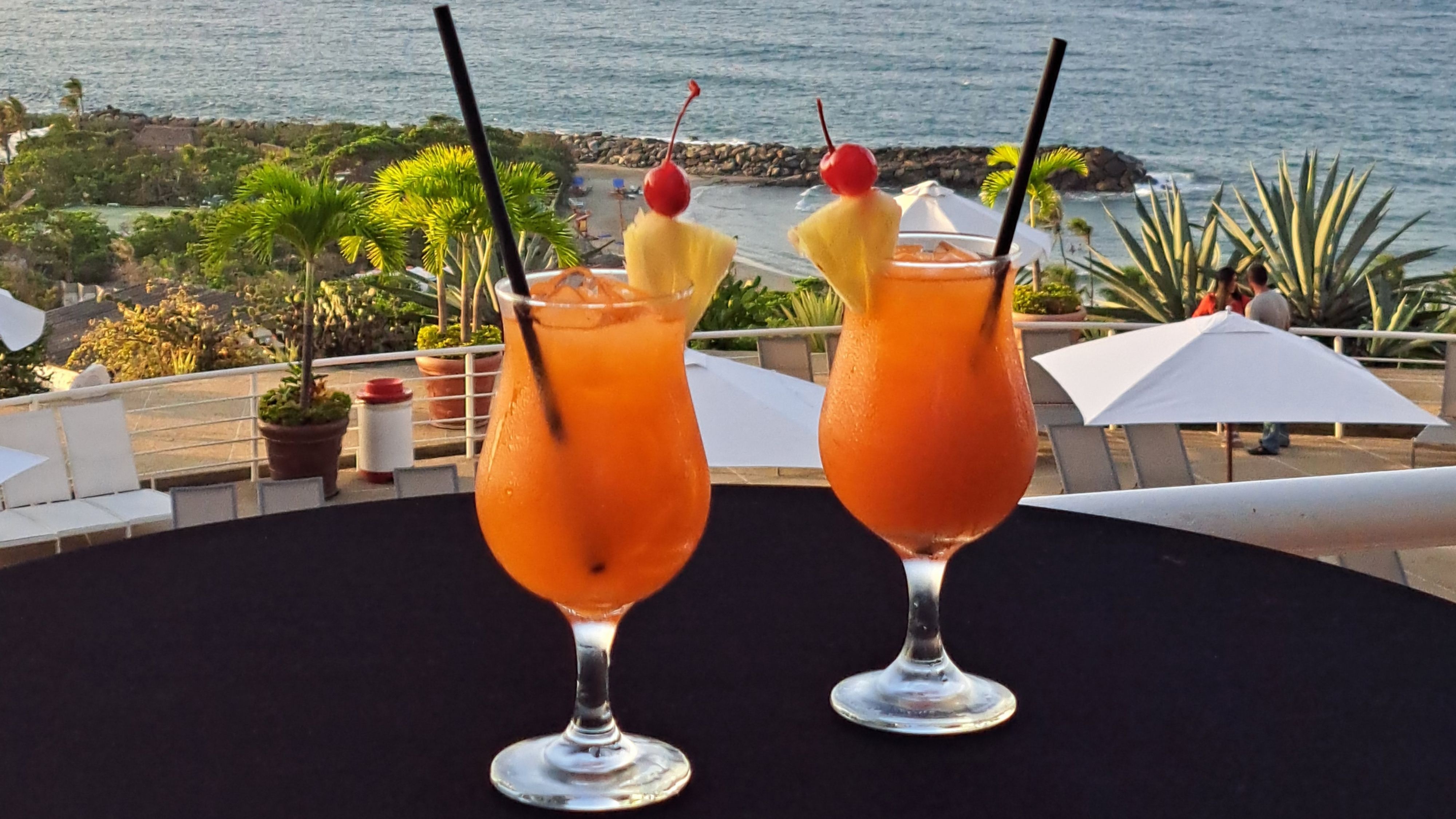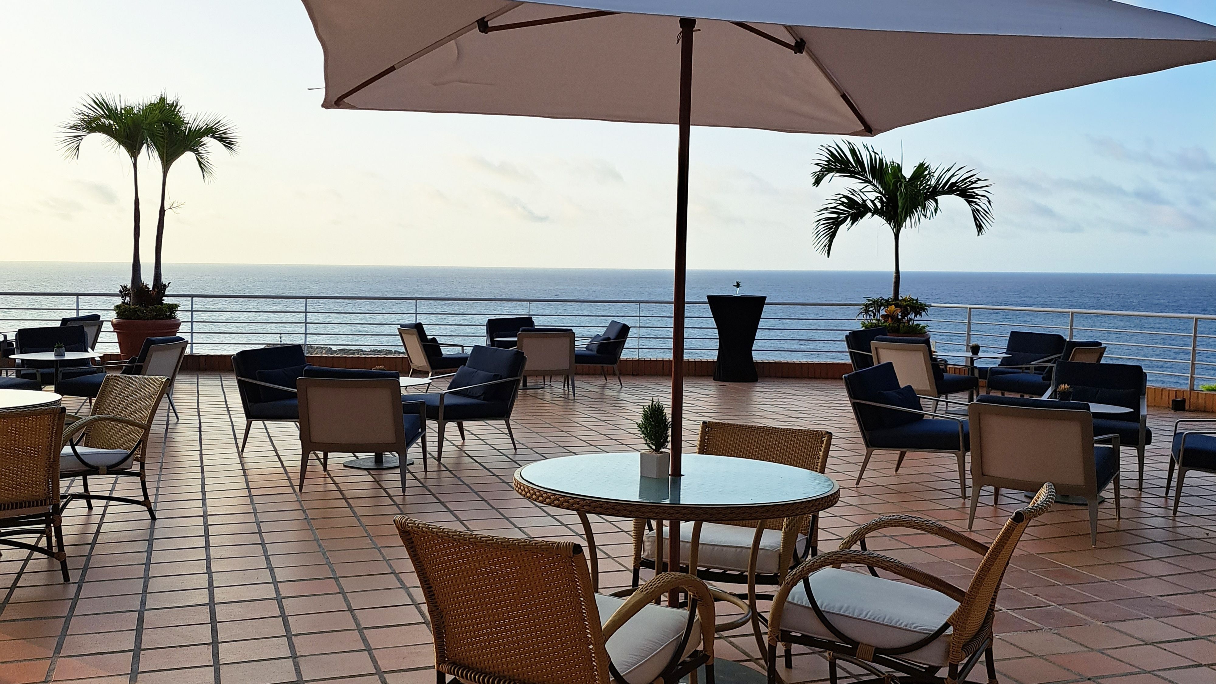 Cabaña de piscina al aire libre con cortinas de amarre y dos sillas reclinable que crean un espacio íntimo y relajante. La tarifa incluye 2 masajes en silla junto a la piscina con una espectacular vista al mar, 2 copas de vino espumoso y una comida ligera.