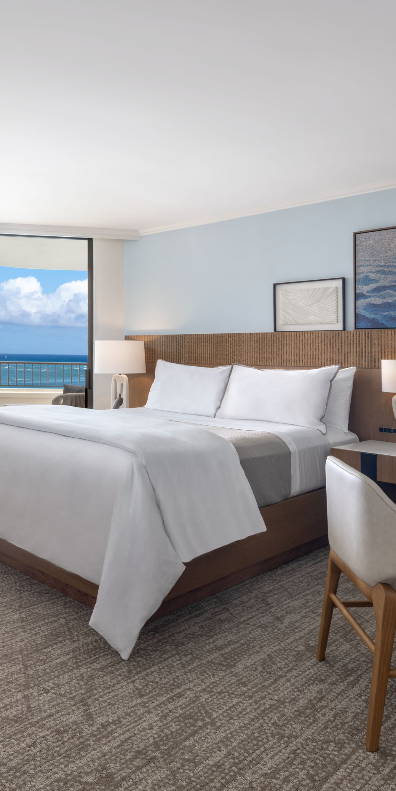 타워 윙은 모던 비치 럭셔리를 만끽할 수 있는 고요한 휴식처로 새 단장을 마치고 고객 여러분을 맞이하고 있습니다. 높은 인기를 자랑하는 넓은 객실이 이곳 타워 윙에 마련돼 있으며, 객실 상당수가 바다, 비치프런트, 다이아몬드 헤드 전망을 제공합니다. 새롭게 단장한 객실은 와이키키 바다의 다양한 색감을 닮은 차분한 컬러 팔레트를 바탕으로, 깔끔하면서도 리드미컬한 패턴과 따뜻한 메탈릭 포인트가 조화를 이루고 있습니다. 또한 맞춤형 좌석과 다이닝 누크, 바닥부터 천장까지 이어지는 라나이 도어를 추가했으며, 실내와 야외를 자유롭게 오가며 휴식을 즐길 수 있는 발코니에는 새 가구를 비치했습니다.